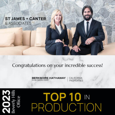 Berkshire Hathaway HomeServices California Properties - St. James + Canter, led by Cristie St. James and Markus Canter, at Berkshire Hathaway HomeServices California Properties, has achieved the outstanding rank of #3 in sales production at the Beverly Hills office for 2023.