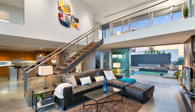 A two-story great room serves as the focal point of the three-story floor plan. In addition to a fireplace and catwalk, the house features floor-to-ceiling walls of glass on one side and pocketing doors that open to a courtyard with a spa and fire pit.