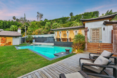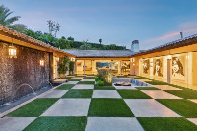 The interior courtyard is made for entertaining, with its spectacular resort-like pool area, kitchen, and guesthouse. A local artist’s striking paintings on the courtyard walls depict legendary musicians Jim Morrison, Jimi Hendrix, Mick Jagger, and Kurt Cobain. Multiple decks afford gorgeous views of the city below. The attached two-car garage is behind a gate where a motor court can accommodate six vehicles.