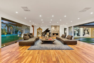 For entertaining, the large family lounge/media room with fireplace under a vaulted wood-beam ceiling boasts a digital projector and blackout curtains for a theater-like experience. One bedroom that opens to a private patio garden, now in use as a home gym, could be converted to a yoga studio or office.