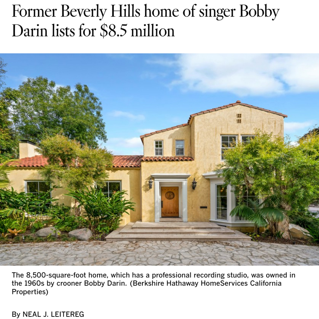 Los Angeles Times article: https://www.latimes.com/business/real-estate/story/2020-01-16/former-beverly-hills-home-of-bobby-darin-lists-for-8-5-million
