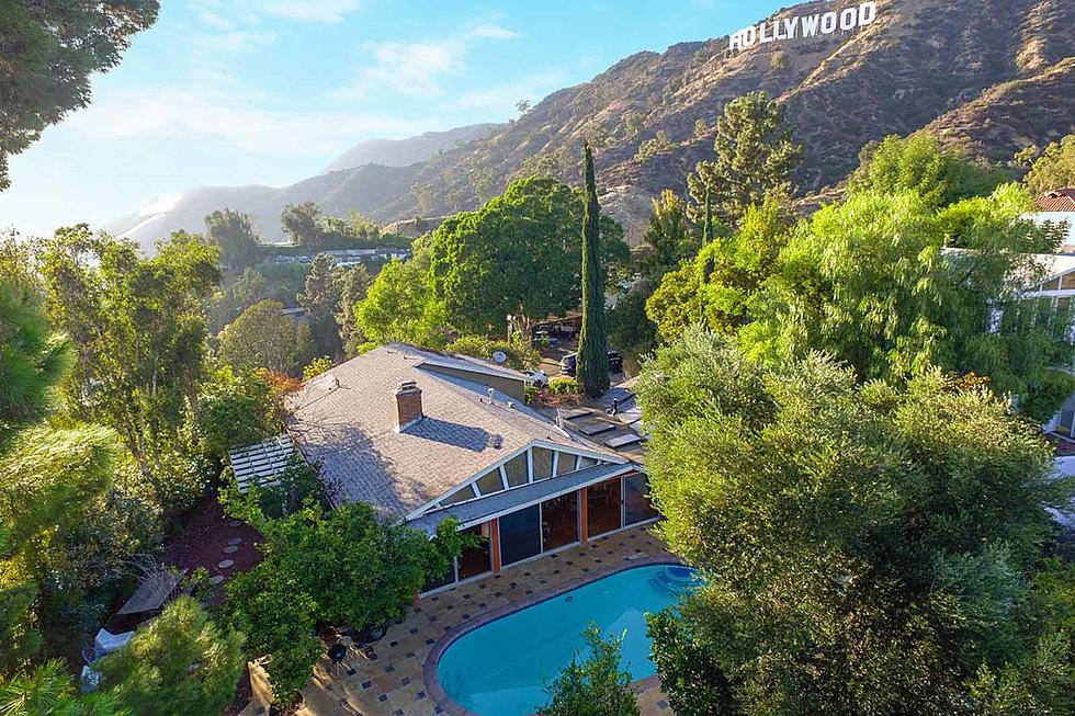 The property, located below the famous Hollywood sign, has three bedrooms and two bathrooms in its 1,437 square feet. But its relatively small footprint is masked through vaulted ceilings, clerestories and skylights that bring in plenty of natural light. It has an open concept living space with hardwood floors throughout. Sliding glass doors lead to the outdoor area, which contains a dining space and a tiled patio surrounding a swimming pool and fire pit, with views of downtown Los Angeles and Griffith Park.