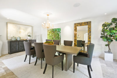 A small gated motor court with garaging for three cars, a densely verdant courtyard garden and a skylight topped entrance gallery lead to a spacious living room designed for both intimate and grand scale entertaining. A fireplace is placed between mirror-backed bookshelves and a wet bar is set in to a curved wall of windows where French doors connect the room to one of the compound’s several serene courtyard gardens. A separate dining room easily seats eight or ten, and the expensively accoutered kitchen is flooded with natural light through a large skylight directly over a doublewide island topped with gleaming black granite. Each of the main house’s three ample bedrooms is en suite.