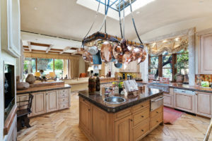 Beyond gates on more than 1.5 acres of oasis-like grounds, the residence offers 16,404 square feet of living space with eight bedrooms, 11 bathrooms, and a gourmet kitchen with a refrigerated walk-in pantry and dry pantry.