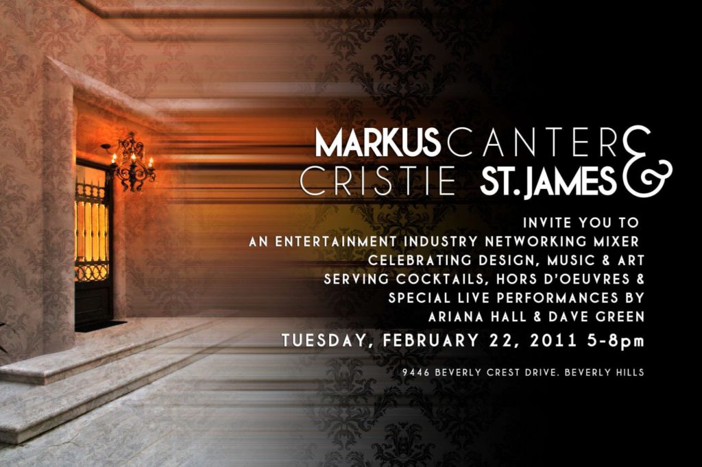 WHAT: Markus Canter & Cristie St. James of ST. JAMES + CANTER will be hosting a social evening of Networking and Music at the inspiring property located at 9446 Beverly Crest DR. Beverly Hills, CA 90210. With special live music performances by Ariana Hall & Dave Green