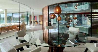 The fortified street façade gives way to radical transparency. Throughout its three stories, retractable glass walls bulge and curl into one another, effectively blurring the ability to accurately discern indoor spaces from the sweeping terraces. Underwater walls of glass in the swimming pool further enhance the interplay between interior and exterior spaces, while the extensive use of hardwoods and other natural materials, including verdant living walls of foliage, connects the home to its natural surroundings.