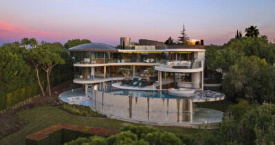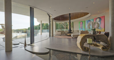 A recently completed home in Quinta do Lago, a bold, sinuous concrete, copper, and glass structure, sits on a nearly three-quarter-acre parcel with long views that extend over the lagoon to Quinta do Lago Beach. Known as Bailarina Villa, the extraordinary property has floated onto the market for €24.5 million (or about $26.1 million). Measuring more than 12,000 square feet—and nearly 17,000 square feet when including the terraces—there are a total of six bedrooms and eight bathrooms.