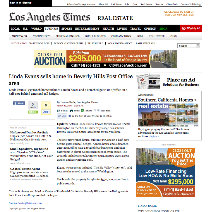 Today’s LA Times cover story | St. James + Canter sell Linda Evans Beverly Hills Home